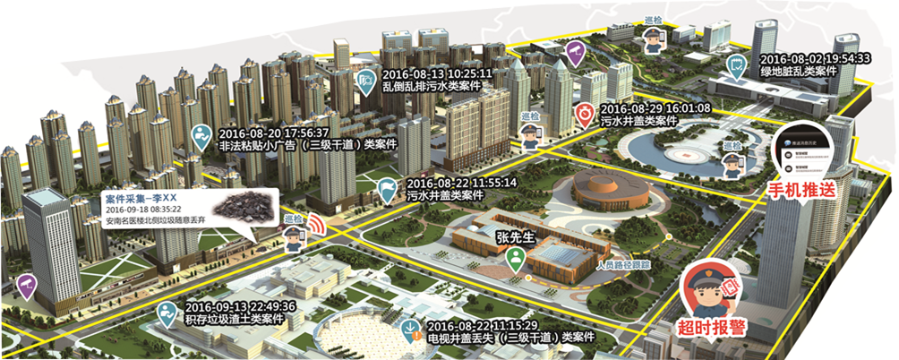 智慧城管管控平臺依托統(tǒng)一的三維地理信息平臺,基于“43221”理論,結(jié)合城市管理部門業(yè)務(wù),將管理單元按照一定的標(biāo)準(zhǔn)劃分成為單元網(wǎng)格。安排網(wǎng)格監(jiān)督員對單元網(wǎng)格的部件和事件巡查,建立一種監(jiān)督和處置互相分離的形式。主要優(yōu)勢是能夠主動發(fā)現(xiàn)并及時處理各類問題,加強管理能力和處理速度,將問題解決在事故發(fā)生之前。