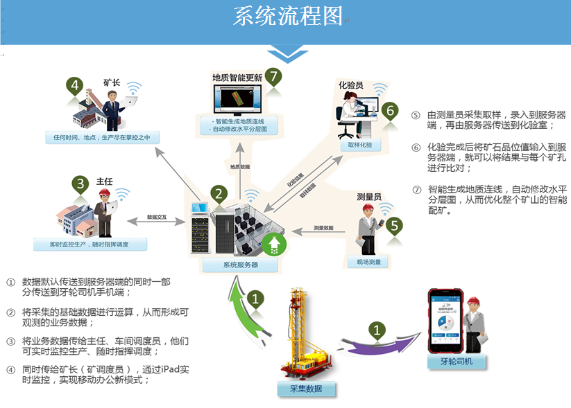 基于“43211”理論的《聚進(jìn)牙輪生產(chǎn)智能管控系統(tǒng)》以聚進(jìn)露天三維采礦綜合信息系統(tǒng)為基礎(chǔ),引進(jìn)高精度智能測(cè)量設(shè)備,提高測(cè)量精度,數(shù)據(jù)采集及時(shí)準(zhǔn)確,極大提高生產(chǎn)工作效率。徹底解決礦山測(cè)量人手不足,戶外測(cè)量工作量大的頑固難題,極大提高測(cè)量數(shù)據(jù)的單位采集率,建立公司級(jí)數(shù)據(jù)應(yīng)用交換平臺(tái),支持?jǐn)?shù)據(jù)和圖像同時(shí)傳輸,地質(zhì)模型實(shí)時(shí)更新、資源信息遠(yuǎn)程共享,實(shí)現(xiàn)過(guò)程控制數(shù)字化,可使操作者直觀立體地感知生產(chǎn)過(guò)程及現(xiàn)場(chǎng)狀況。