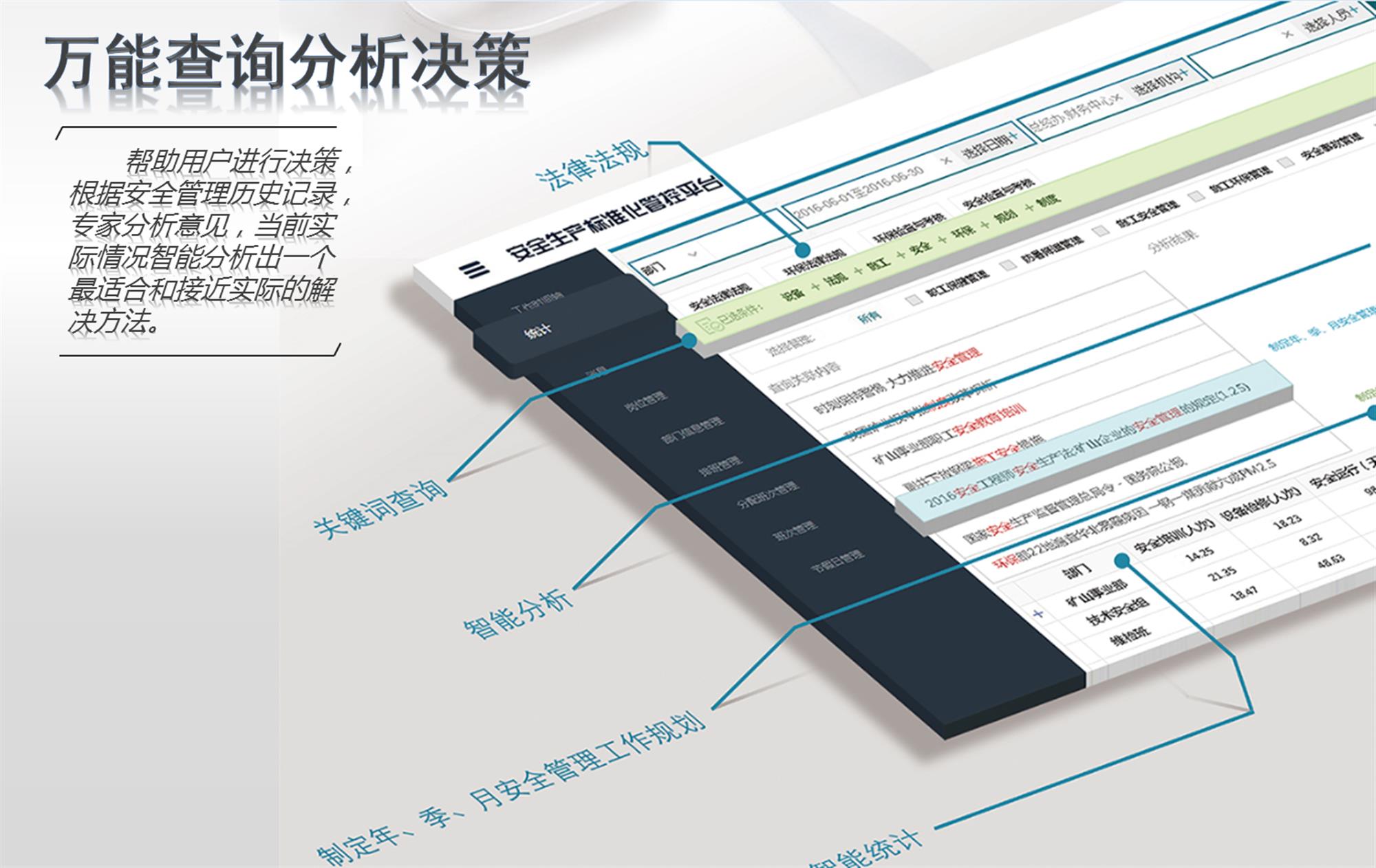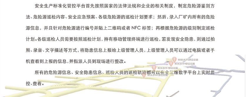 安全生產(chǎn)標準化管控平臺是遼寧聚進科技有限公司智慧企業(yè)建設的一個重要部分;是實現(xiàn)業(yè)務規(guī)范化、過程標準化、管控智能化、績效分析自動化的行業(yè)領先的應用平臺系統(tǒng);該平臺以國家安全法律法規(guī)、相關政策為基礎,以企業(yè)崗位責任制度為參照,采用B/S應用架構、大型數(shù)據(jù)倉庫技術、移動終端互聯(lián)網(wǎng)開發(fā)技術、“仿真三維”數(shù)字建模技術、GIS應用技術以及大數(shù)據(jù)挖掘技術等領先科研成果與技術研發(fā)而成,為企業(yè)提供自下而上的一線安全管理作業(yè)數(shù)據(jù)。