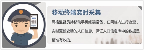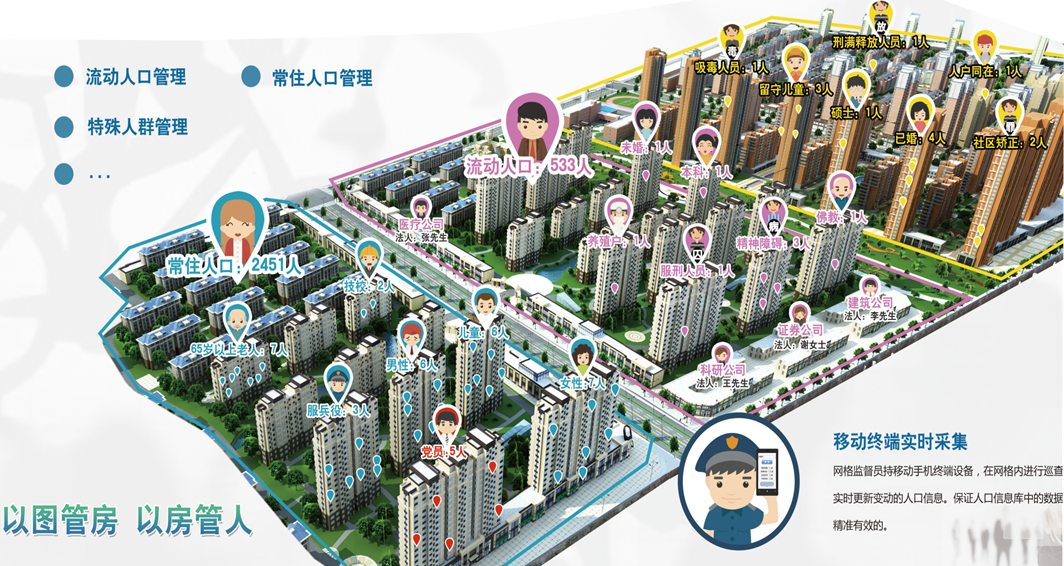 人口信息管理系統(tǒng)通過在社區(qū)、街道安排網(wǎng)絡(luò)監(jiān)管員,以公安人口信息為核心,以公民身份證號(hào)碼為唯一代碼,進(jìn)入人口基礎(chǔ)信息的實(shí)時(shí)采集和更新,內(nèi)容包括住址、政治面貌、家庭成員、不良行為、工作變更記錄、教育經(jīng)歷、人員流動(dòng)記錄、社會(huì)貢獻(xiàn)等39大類200多個(gè)小項(xiàng)信息。同時(shí),將城市中的房產(chǎn)和人口信息相關(guān)聯(lián),通過不動(dòng)的房產(chǎn)對(duì)流動(dòng)的人口在地里信息系統(tǒng)上進(jìn)行定位及管理,實(shí)現(xiàn)“以房管人”,實(shí)現(xiàn)對(duì)城市中的常住人口、流動(dòng)人口、以及特殊人員的管理,可以服務(wù)于社會(huì)治安管理部門、衛(wèi)生與計(jì)劃生育部門、教育部門、住建部門、房產(chǎn)部門、黨組織等多個(gè)部門。